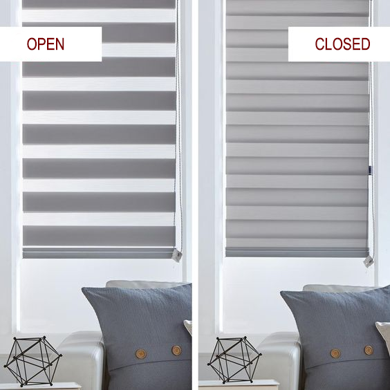 Caracteristica definitorie a roletelor Day & Night este alternanța dungilor opace cu cele transparente, țesute direct în materialul textil. Prin deplasarea materialului, dungile se pot: